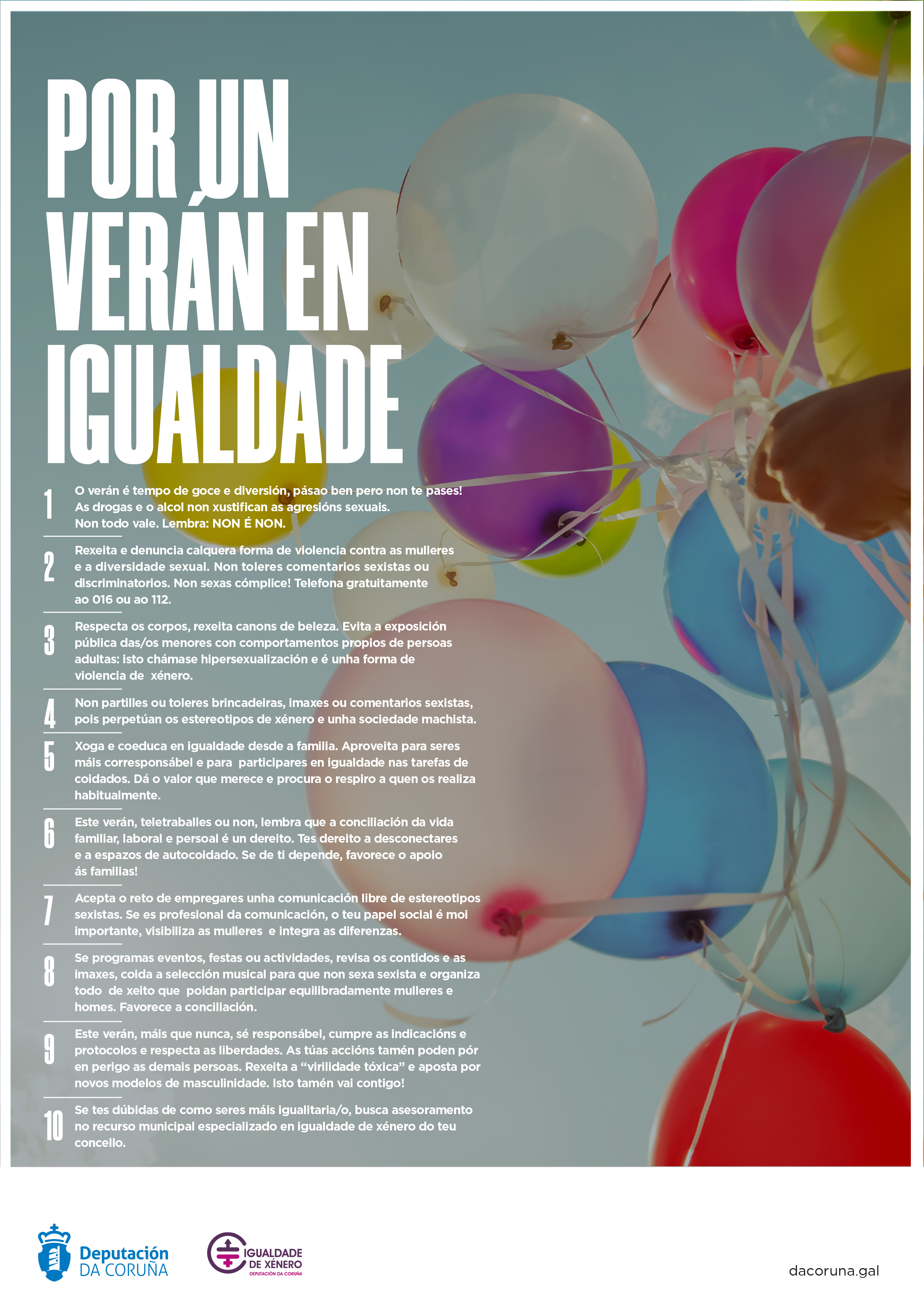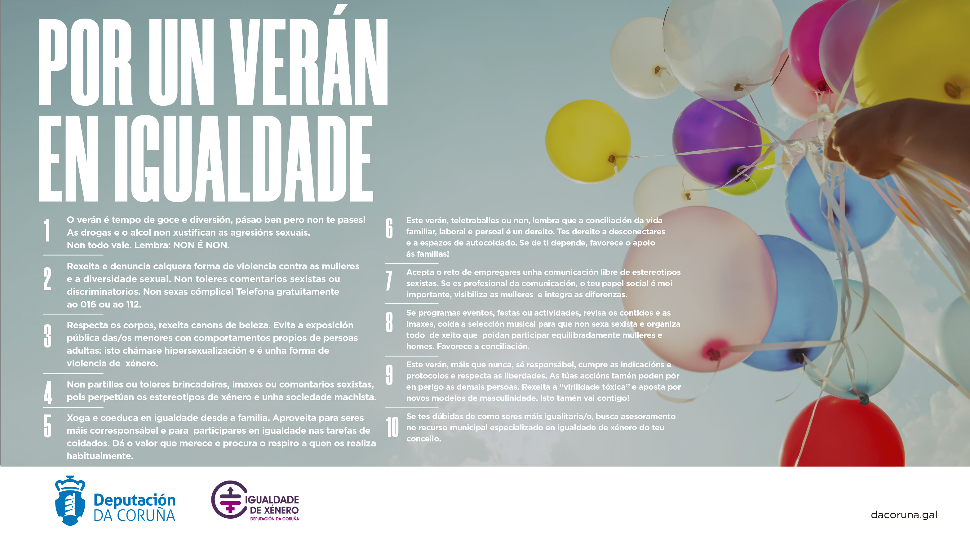 Desde Igualdad de la Diputación de A Coruña se ponen en marcha en el marco de su Plan de Igualdad 2018/2023 (www.compartimosplan.com) una campaña para promover unas fiestas en igualdad, este proyecto comenzó en el Nadal de 2019, continuo en el Carnaval 2020 y finaliza con el Decálogo por un verano en igualdad.